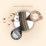 - Nano-fibra con tratado iónico con polvo de cobre entretejido con propiedades biocidas mejoradas. La combinación de hilo y cobre maximiza sus propiedades. Esta fibra de cobre está científicamente certificada para ser 99% efectiva en eliminar microbios